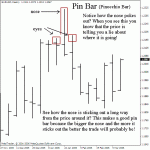 Смотрите как нос (nose) выдается вперед. Когда вы видите это, вы знаете, что цена вас обманывает, она не собирается идти вверх. Обратите также внимание на то, как пин бар выдается вверх по сравнению с остальными барами, чем больше нос, тем лучше.